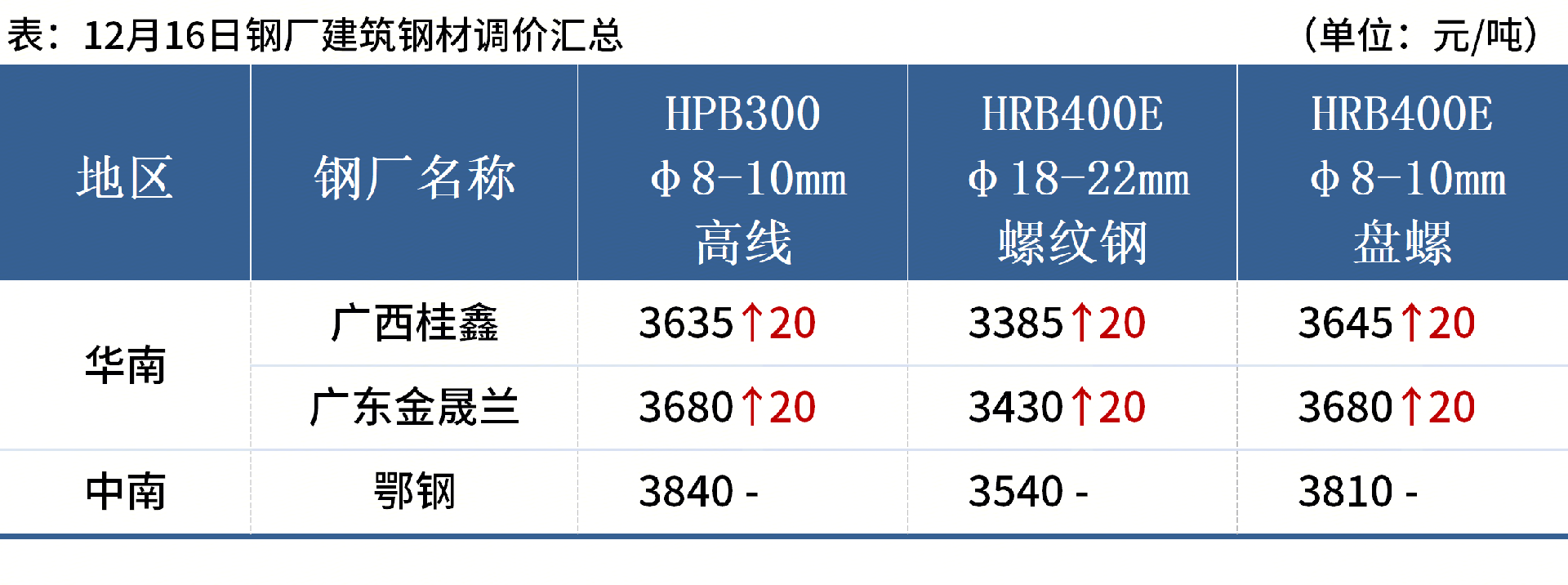 ◎云南區域主要建筑鋼材生產(chǎn)企業(yè)對建筑鋼材產(chǎn)品各規格價(jià)差作調整:Ф18規格上調200元/噸,Ф20規格不變,其余規格上調100元/噸,本次調整以HRB400EФ20為基準價(jià)格,其他規格在此基礎上按極差加價(jià)。詳情>>
