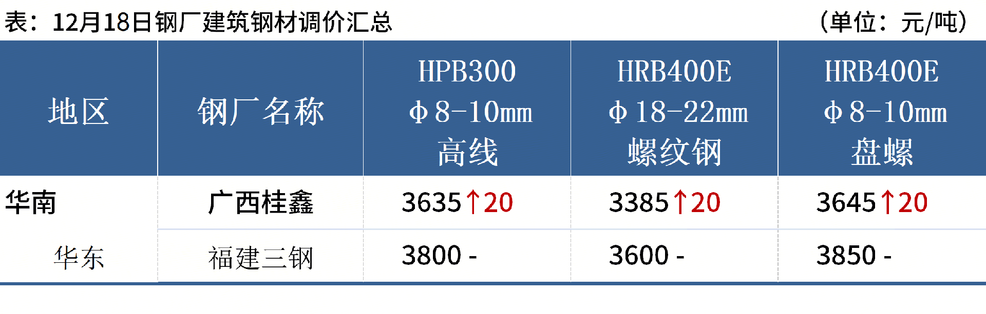 ◎攀鋼集團攀枝花鋼釩計劃12月19日開(kāi)始停產(chǎn)檢修一座1200m3高爐,檢修影響日均鐵水產(chǎn)量0.35萬(wàn)噸左右,復產(chǎn)時(shí)間待定。