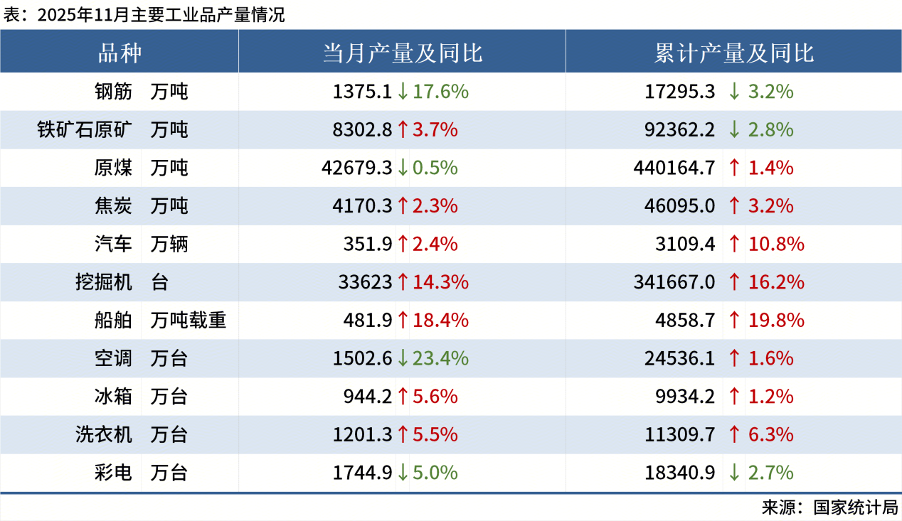 ◎國家統計局數據顯示,2025年11月份,中國鋼筋產(chǎn)量為1375.1萬(wàn)噸,同比下降17.6%;1-11月累計產(chǎn)量為17295.3萬(wàn)噸,同比下降3.2%。其他主要工業(yè)品產(chǎn)量如下: