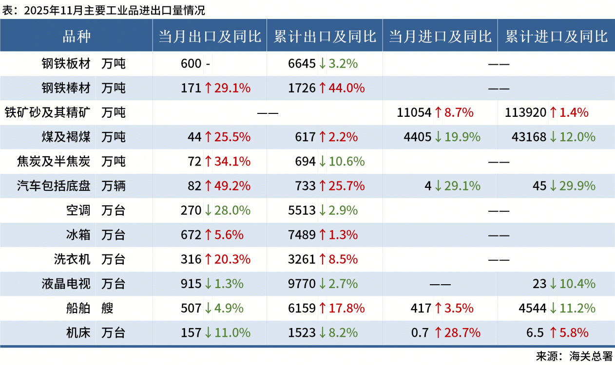 ◎海關(guān)總署數據顯示,2025年11月,中國出口鋼鐵板材600萬(wàn)噸,同比持平;1-11月累計出口6645萬(wàn)噸,同比下降3.2%。其他主要工業(yè)品進(jìn)出口情況如下: