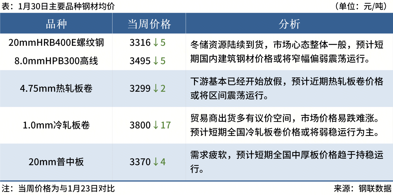 ◎1月26日-1月30日,全國(guó)螺紋鋼均價(jià)為3316元/噸,周環(huán)比下跌0.15%;螺紋鋼周產(chǎn)量199.83萬(wàn)噸,增長(zhǎng)0.14%;庫(kù)存475.53萬(wàn)噸,增長(zhǎng)5.18%;消費(fèi)量176.4萬(wàn)噸,下降4.92%。