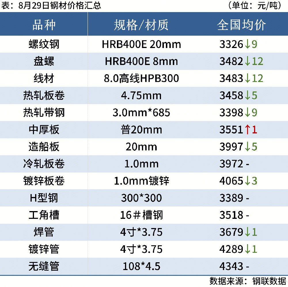 螺紋鋼:8月29日,全國31個(gè)主要城市20mm三級抗震螺紋鋼均價(jià)3326元/噸,較上個(gè)交易日跌9元/噸。短期來(lái)看,供需基本面矛盾逐步累加,預計下周?chē)鴥冉ㄖ摬膬r(jià)格或將延續偏弱震蕩運行態(tài)勢。