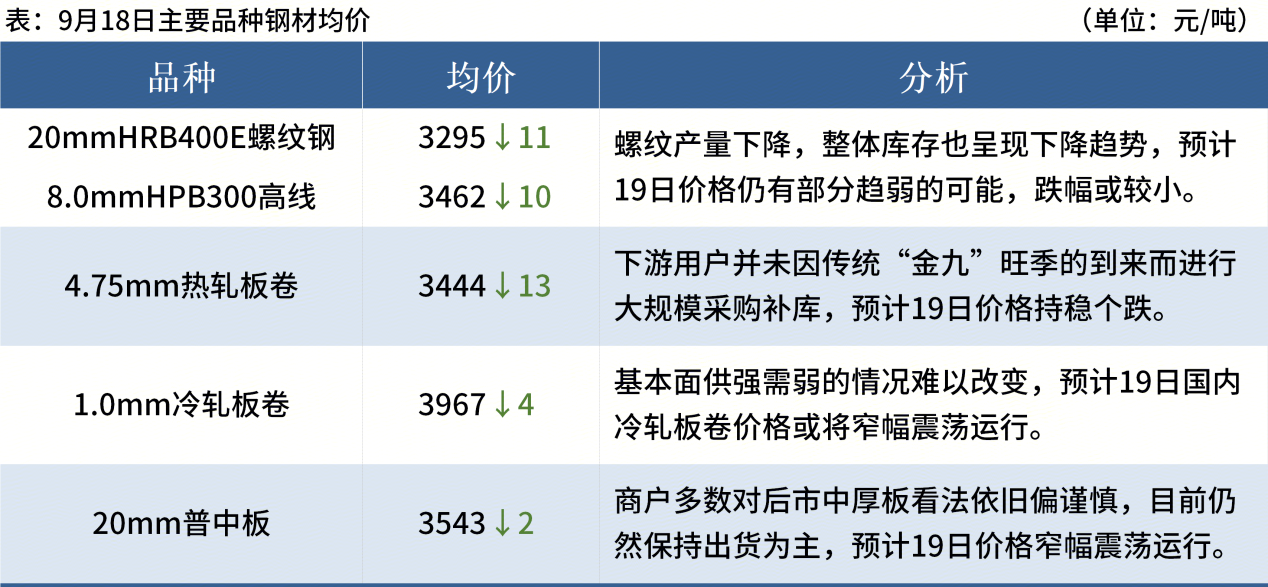 ◎ 9月18日,全國主港鐵礦石成交97.40萬(wàn)噸,環(huán)比減23%;237家主流貿易商建筑鋼材成交8.78萬(wàn)噸,環(huán)比減14.5%。