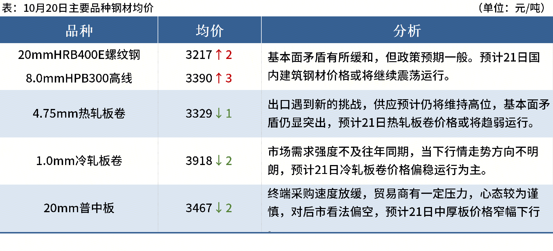 ◎10月20日,中天鋼鐵出臺10月下旬價(jià)格,螺紋下調50元/噸,線(xiàn)材盤(pán)螺下調50元/噸?,F華東螺紋3350元/噸,線(xiàn)材盤(pán)螺3550元/噸。