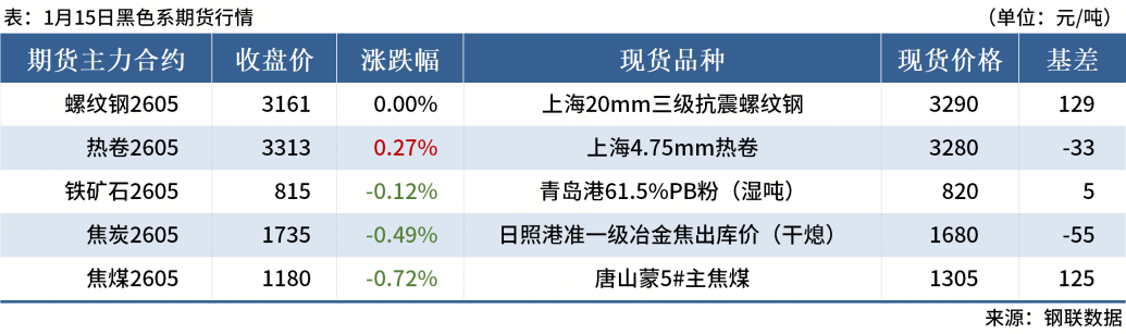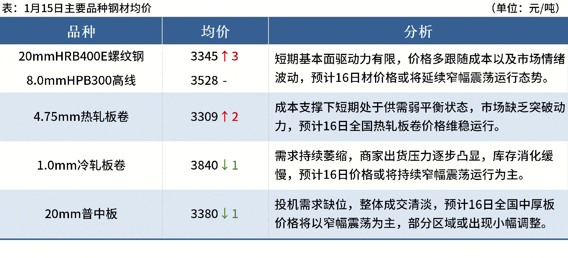 ◎1月15日,全國主港鐵礦石成交98.12萬噸,環(huán)比減20.3%;237家主流貿易商建筑鋼材成交8.62萬噸,環(huán)比減2.7%。