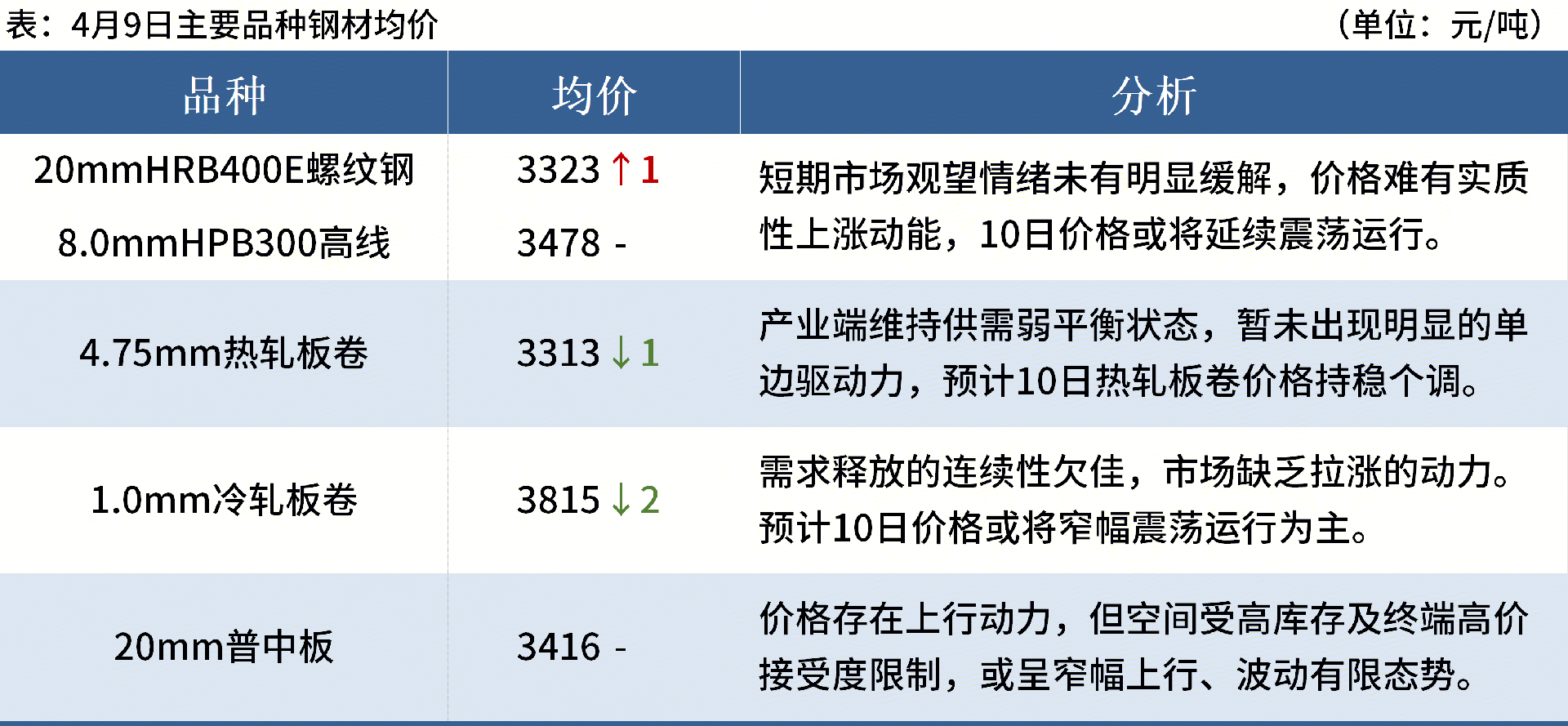 ◎ 4月9日,國內(nèi)鋼材市場震蕩趨弱,唐山遷安松普方坯出廠含稅跌20報2960元/噸。